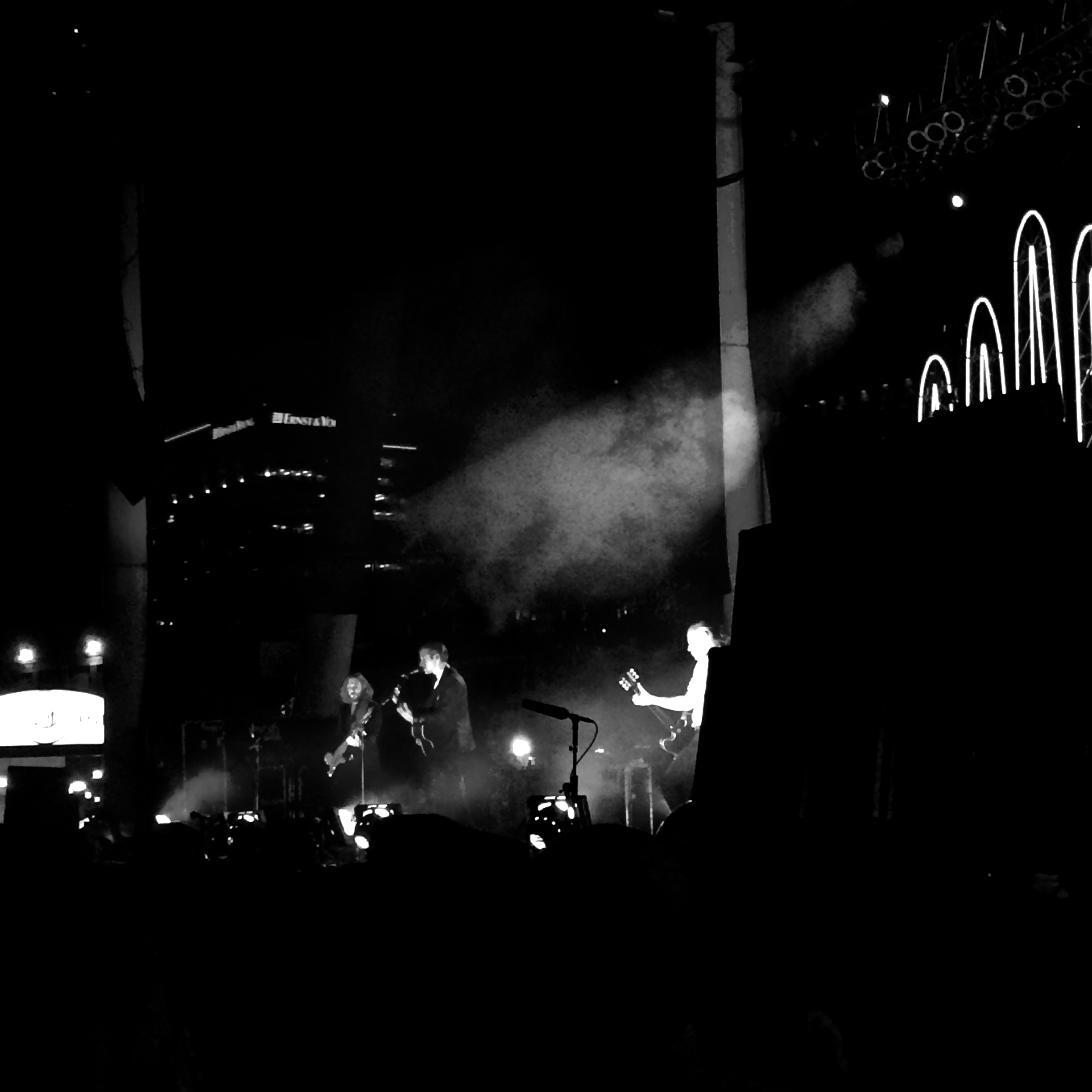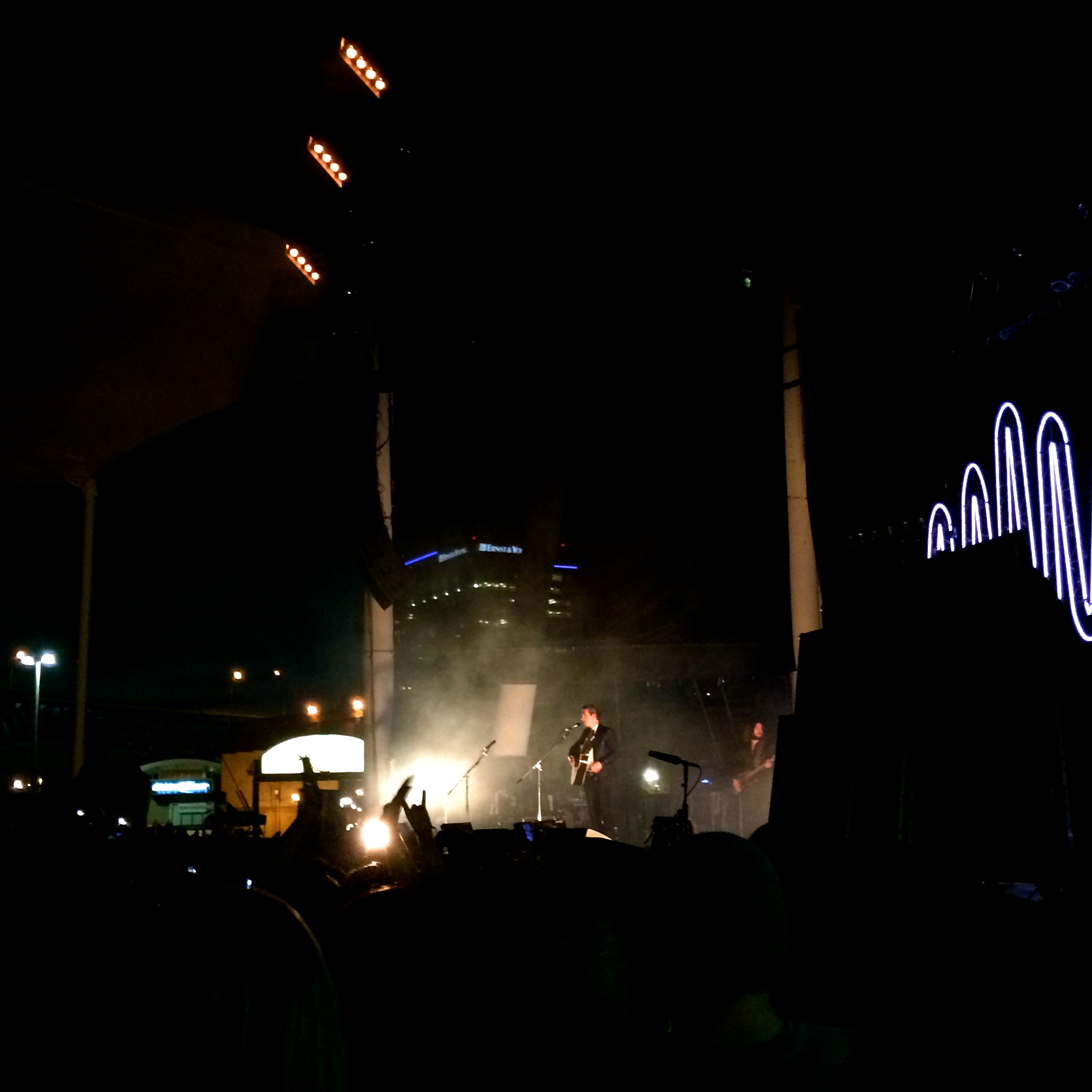 The best part about the show was the nice weather and staging. Early summer is the best time to see shows at Nautica because it’s temperate and therefore more enjoyable. Before the band emerged from the side of the stage, fog rolled out into the audience. White and subtle orange lights cast an eerie glow over the crowd as creepy introductory music was played. The band opened with their arguably largest number “Do I Wanna Know?” that got the crowd roaring immediately. Swinging arms and dancing bodies filled the pit below the bleachers before they even finished the song. Just before the second, the squiggle backdrop lit up. This is pictured on the front of their latest album, AM, which features both letters hidden in the center.